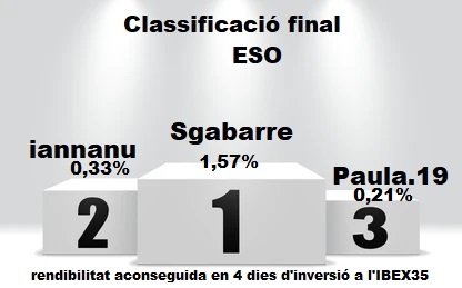 Ja tenim classificació final del projecte educatiu MasterBolsa2017. Després de 2 setmanes d'inversions amb els millors traders dels instituts de la Catalunya Central, dels centres educatius:
